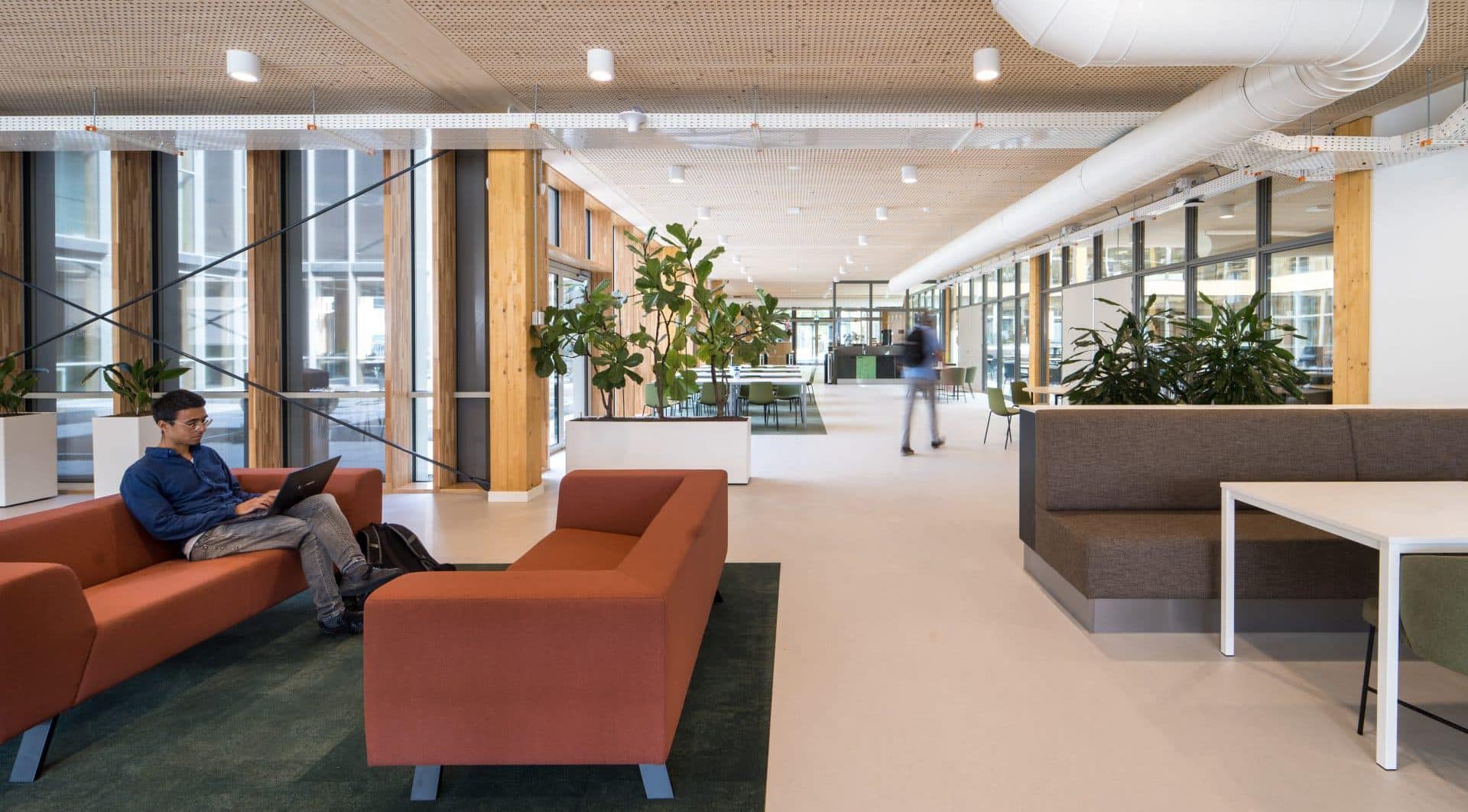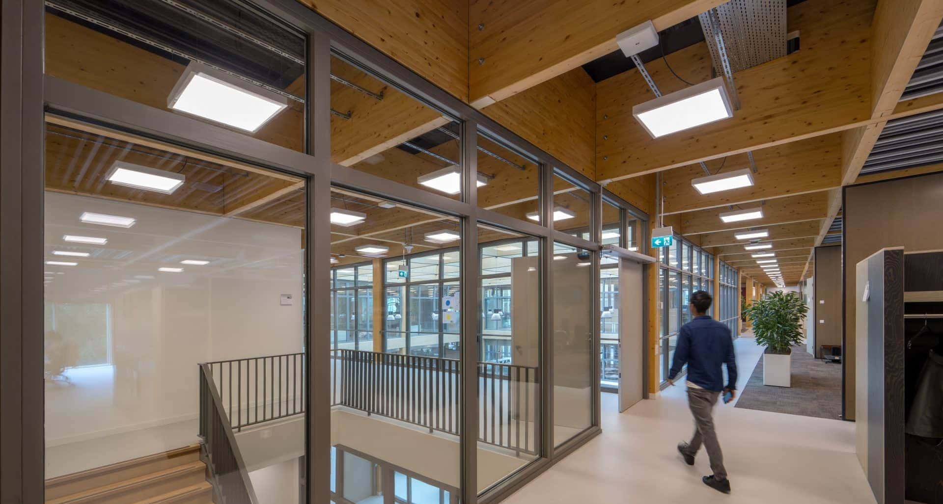 In opdracht van Van Delft Installatieprojecten heeft Maas & Hagoort de verlichting gerealiseerd. Dit is gedaan conform het advies van Boink Project- & Energiemanagement. Maas & Hagoort zorgde voor alle armaturen in het gebouw, met uitzondering van de lichtlijnen. Het nieuwe Weener XL-gebouw heeft een Cross Laminated Timber (CLT)-constructie met massieve houten panelen. Door de vaste stramienmaat lagen alle montageposities constructief vast. Bij een CLT constructie kunnen namelijk niet zomaar extra sparingen of montagepunten worden gemaakt. Hierdoor is er weinig flexibiliteit was voor het plaatsen van armaturen. Onze sales engineers selecteerden daarom armaturen die binnen de armatuurposities toch de vereiste lichtprestaties leveren. Het resultaat is een lichtoplossing passend bij de NEN-EN 12464-1 norm. Deze oplossing sluit naadloos aan bij de circulaire en energie neutrale doelstellingen van Weener XL.